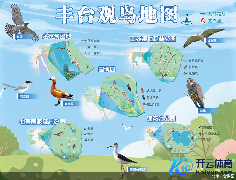 “丰台不雅鸟舆图”则是由南苑丛林湿地公园、莲花池公园、永定河边的绿堤田园公园、北京园博园、北宫国度丛林公园五大公园串联起来,全年可相遇红隼、雀鹰等百余种鸟类。