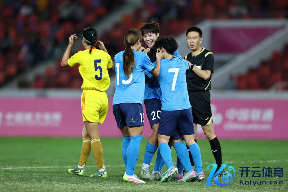 11月13日,江苏队球员在比赛中庆祝进球。当日,在佛山进行的第十五届寰宇畅通会女足半决赛中,江苏队2:1慑服上海队。新华社记者 王鹏 摄