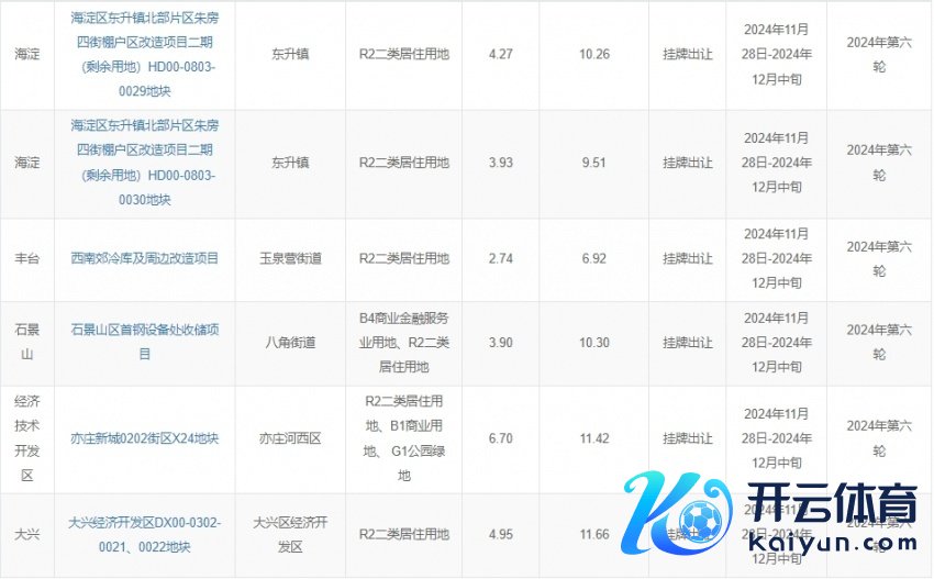 网房产北京讯 11月28日,北京市策划和当然资源委员会网站发布了《2024年度第六轮拟供应商品住宅用地清单》,共触及五区6宗地宗地,地皮面积约26公顷,建筑界限约60万普通米,其中海淀区2宗、丰台区、石景山区、大兴区、经济本领征战区各1宗,清单内方法将于2024年12月中旬前供应。