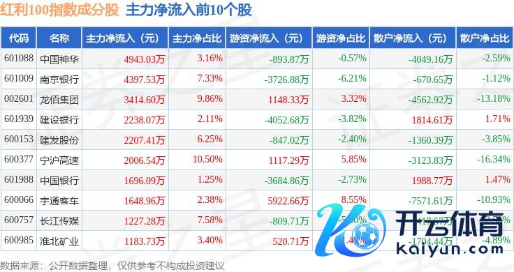 资金流向方面,红利100(399411)指数成份股当日主力资金净流出共计18.63亿元,游资资金净流入共计5.95亿元,散户资金净流入共计12.68亿元。成份股资金流向细目见下表: