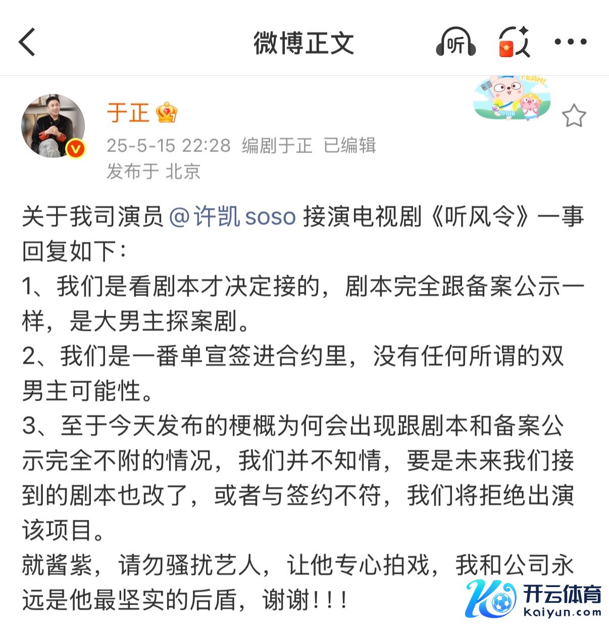 这一音书连忙在采集上激发烧议,将许凯再次推上公论风口浪尖。在此之前,也曾有博主爆料,剧集《听风令》将于9月24日开机,况且早在本年五月,于正就曾报告过许凯接演剧集《听风令》的“双男主”传奇。其时他发文称,当初接演是一番单宣签进合约里,莫得任何所谓的双男主可能性。他同期示意,近期发布的简易为何出现跟脚本和备案公示扫数不符的情况,他们并不知情,若是昔时接到的脚本也改了,未必与签约不符,许凯将阻隔出演该名目。