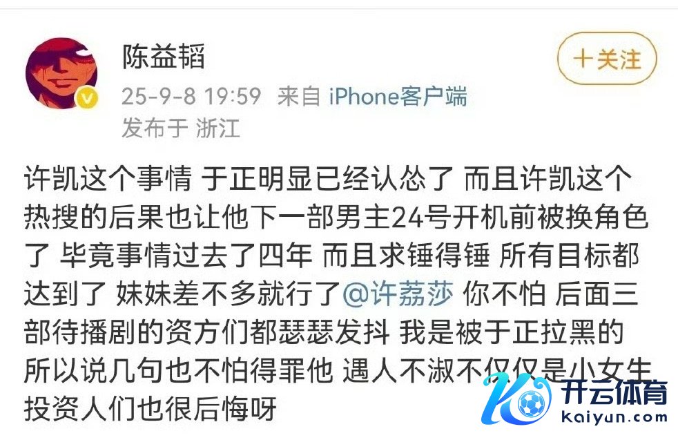 近日,演员许凯身陷多重公论风云,而曾制作《怎样BOSS要娶我》的制片东谈主陈益韬又于9月8日晚公开爆料,许凯的下一部男主剧24日开机前被要紧换角。