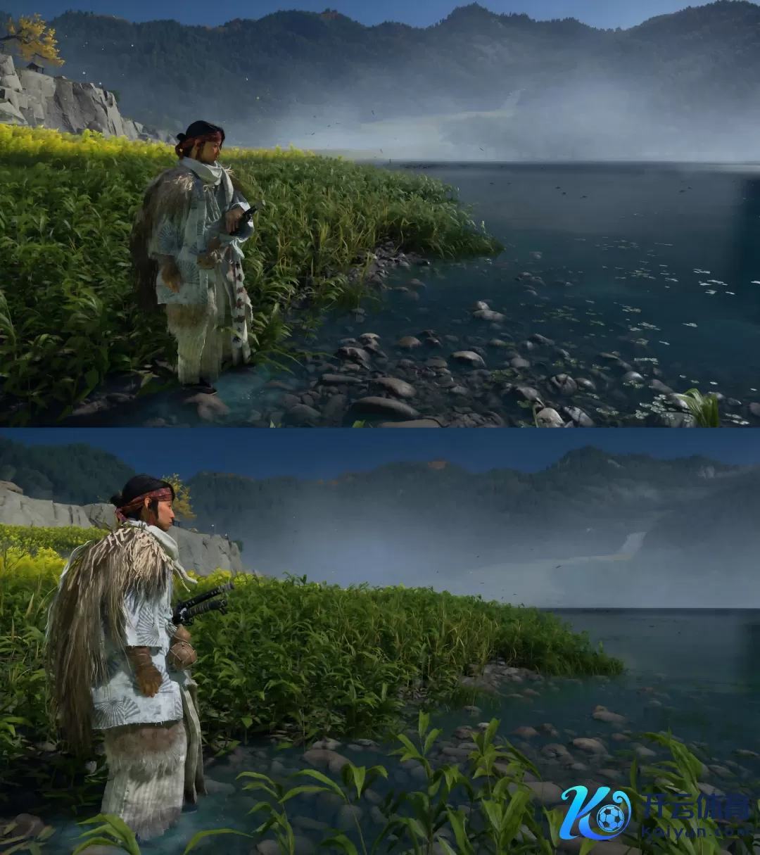 另一方面,即即是在开启合并档画面模式的前提下,PlayStation 5 Pro版的画面进展,比拟第一版亦有进步。以底下这张水边截图为例,上方由第一版PlayStation 5渲染的东说念主物服装暗影细节,较着莫得底下的PlayStation 5 Pro版丰富天然。而远方的山景,在PlayStation 5 Pro上看起来也比第一版PlayStation 5的愈加显着。