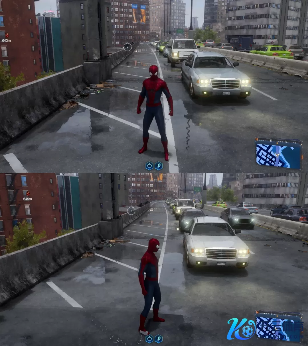 拍照模式在疏通时间和天气下,PlayStation 5版开启“清朗跟踪”(上)对比PlayStation 5 Pro开启“清朗跟踪PRO”(下)