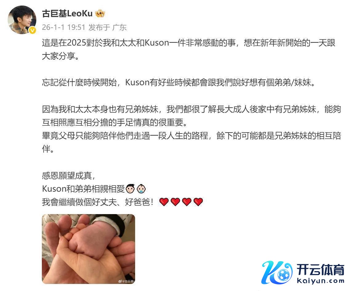 古巨基发文称,大女儿Kuson有些时辰會跟他们说好思有个弟弟或者妹妹,况兼他和太太也有昆玉姐妹,很了解长大后昆玉不错相互照拂。如今愿望成真,太太生下了二胎弟弟,古巨基还晒出一家四口的手部合影,大手包小手,非常幸福呢。古巨基还暗意我方会链接作念個好丈夫、好爸爸。