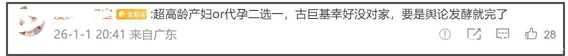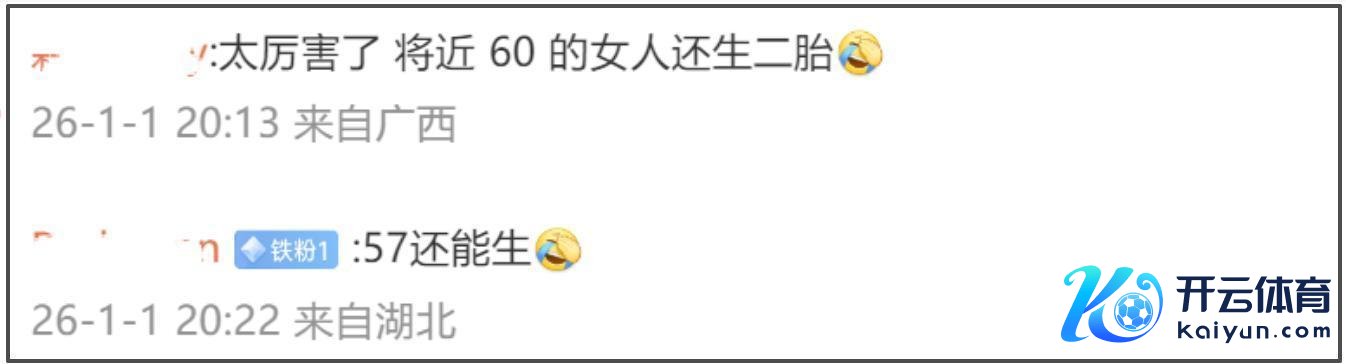 还有网友对57岁生孩子存疑,认为生第一胎的时辰就认为奇怪,50多岁能生孩子是古迹,有网友认为应该是冻卵了,然而冻卵也要躬行怀才行,以至有不少网友忖度可能是代孕的,惊羡辛亏古巨基没对家,否则这公论发酵得翻大车。代孕在我国属于造孽行径,是以如故但愿网友感性看待和吃瓜。