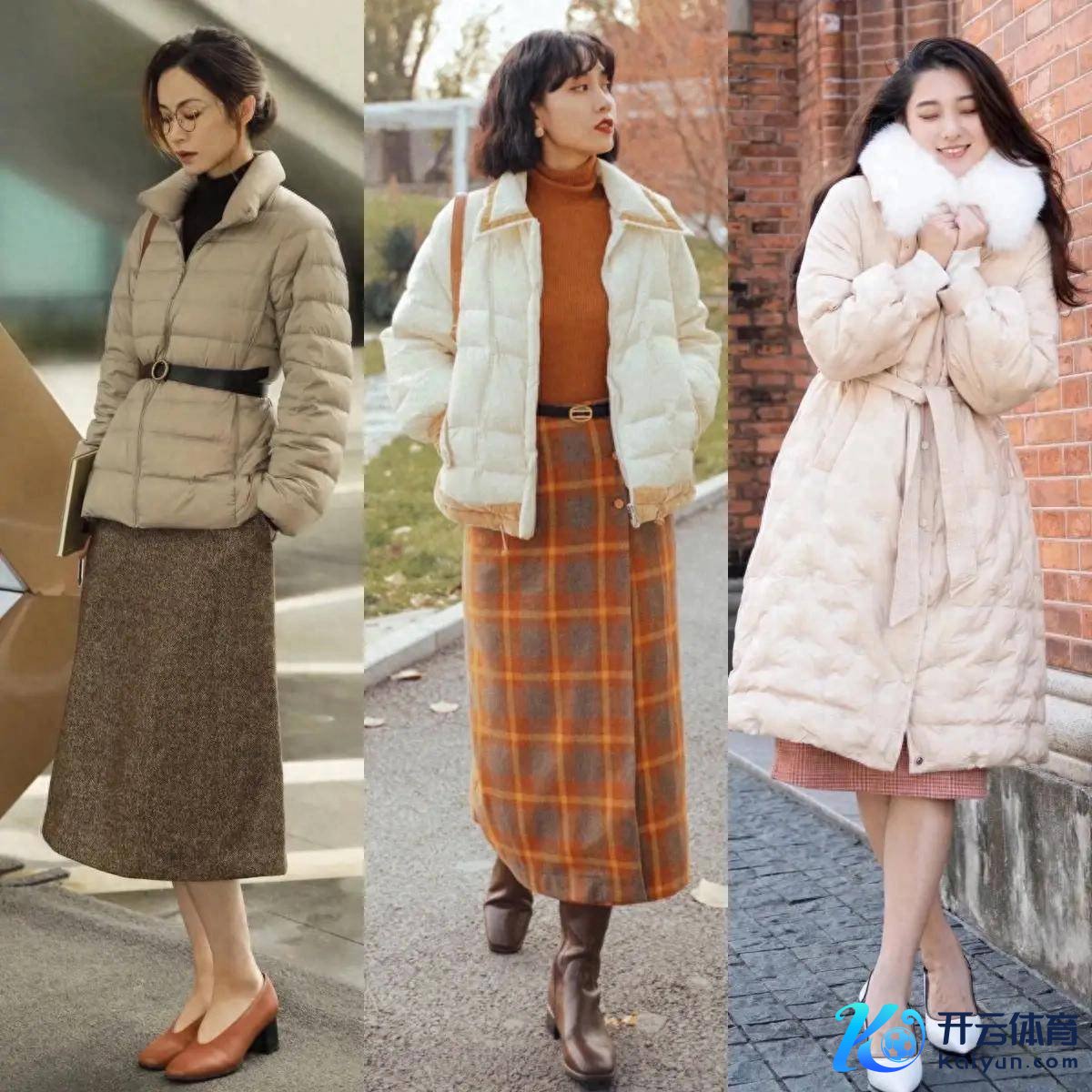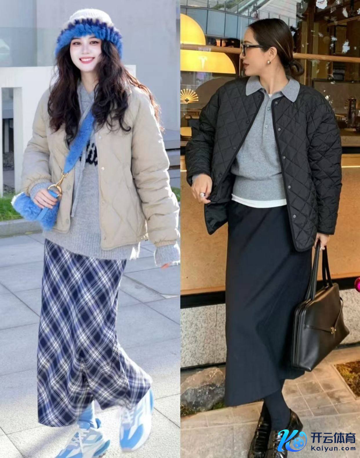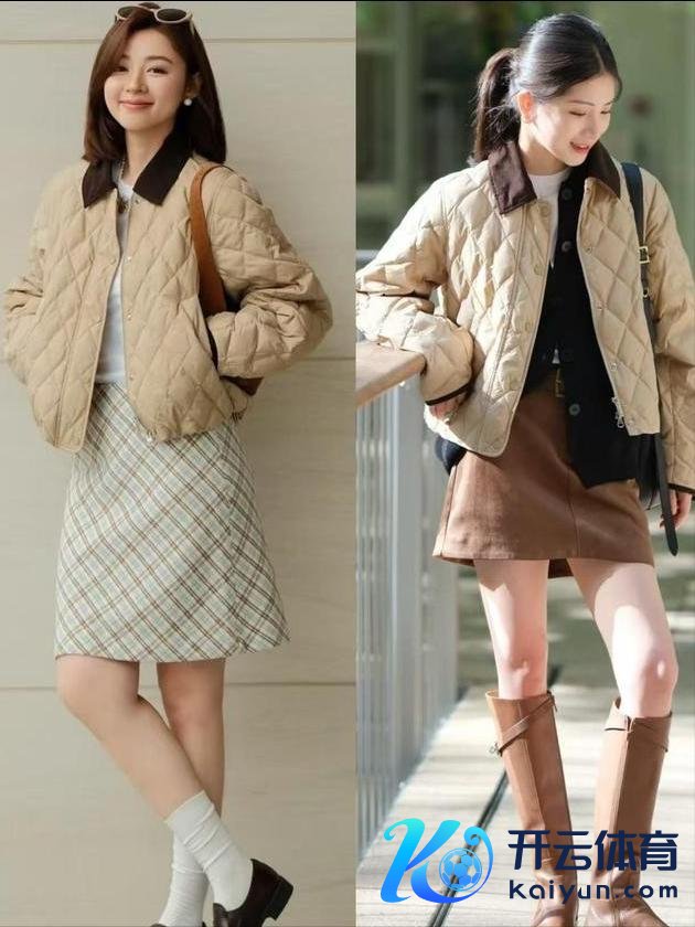 上头右边的这位素东谈主换成了自带高腰收腰款的绗缝棉服,内搭红色的半高领真诚衫,加上口舌格纹的直筒半身裙,就显得优雅多礼,同期又能提高腰线。