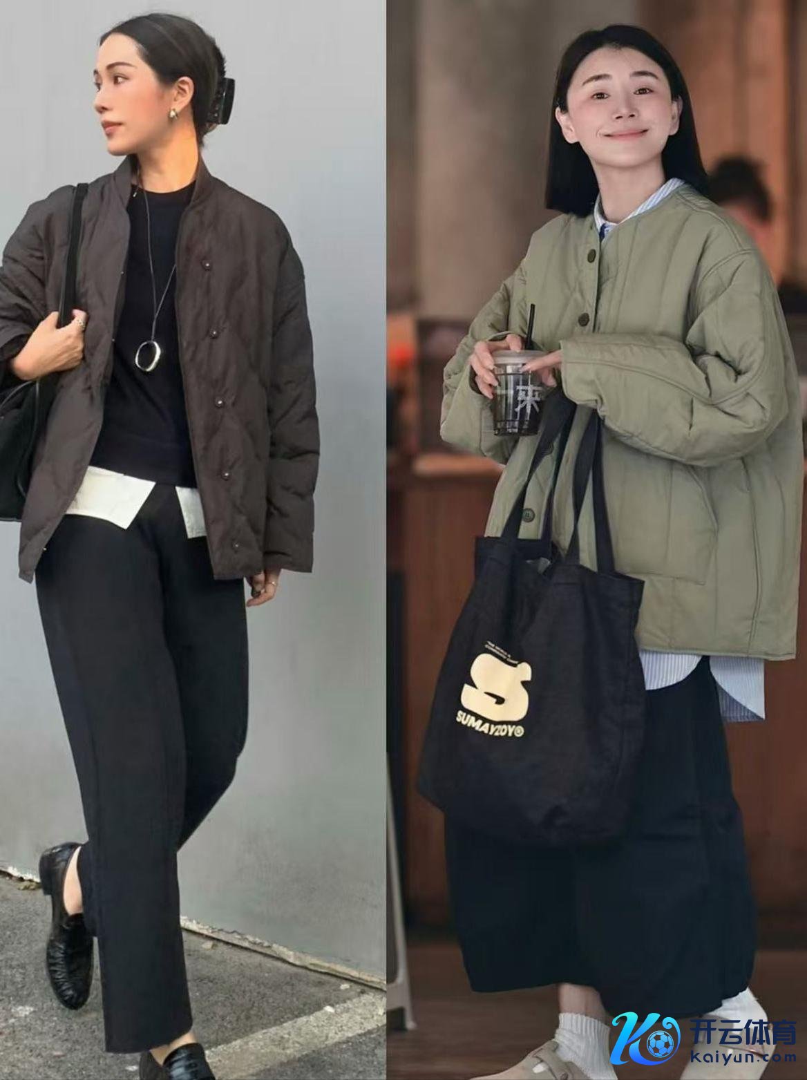 相同是绗缝棉服,然则搭配的夏装不同,呈现出来的成果有着很大的分袂,举例上头左边这位前锋博主,用一条玄色的直筒9分西装裤在搭配上深咖色的绗缝棉服,叠穿玄色真诚衫和白色衬衫衫,这么的穿搭通勤漂后又干练。