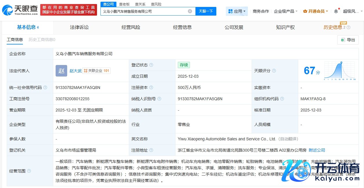 南边财经12月5日电,天眼查App知道,近日,义乌小鹏汽车销售办事有限公司树立,法定代表东谈主为赵大武,注册本钱500万东谈主民币,策画规模包括汽车销售、新动力汽车整车销售、新动力汽车电附件销售、无邪车充电销售等。激动信息知道云开体育,该公司由小鹏汽车销售有限公司全资握股。