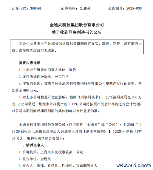 9月30日,金通灵收到的《刑事判决书》剖析,上海市第三中级东谈主民法院(以下简称法院)一审判决被告单元金通灵犯欺骗刊行证券罪,判处罚金800万元。