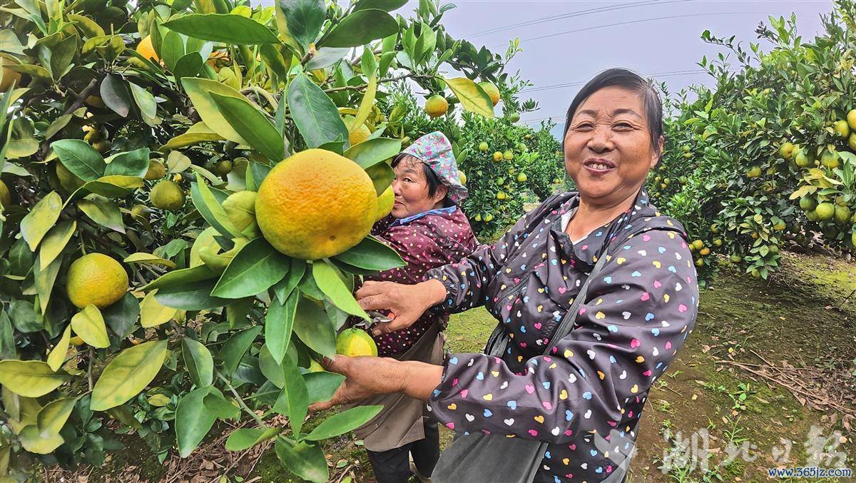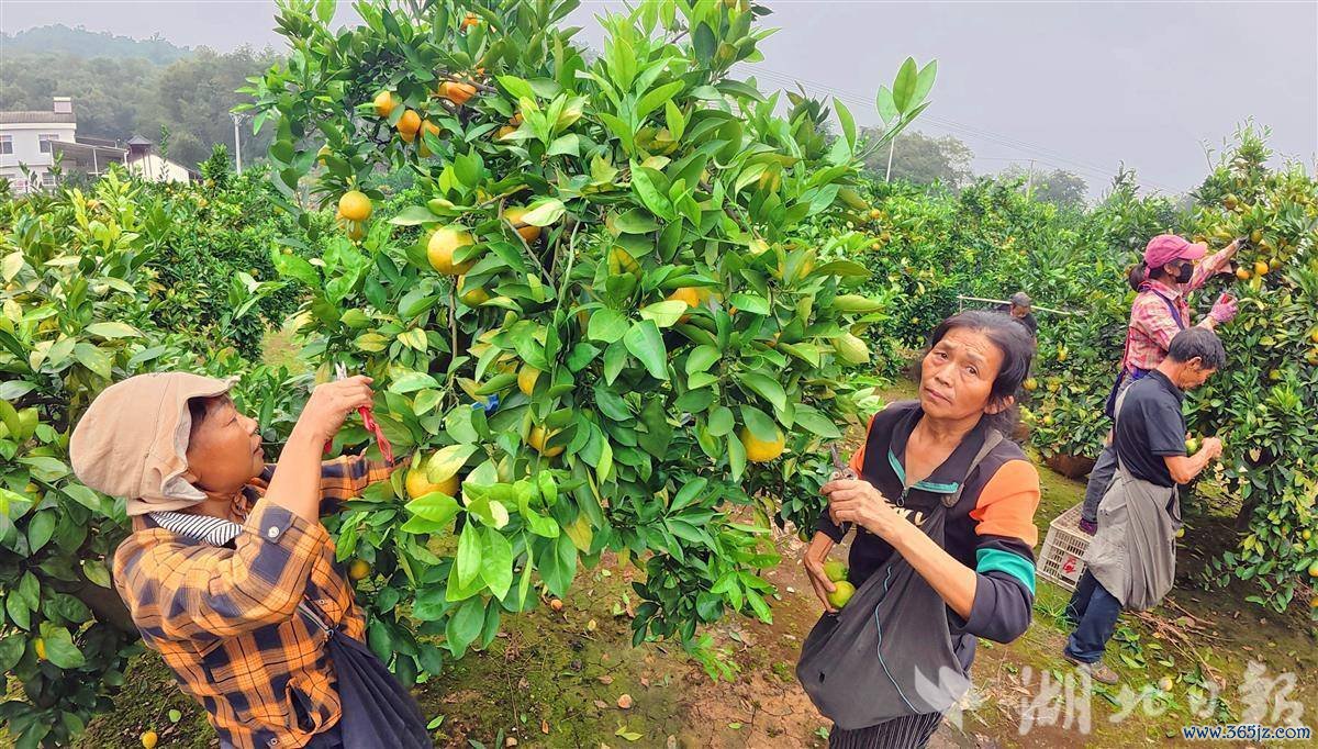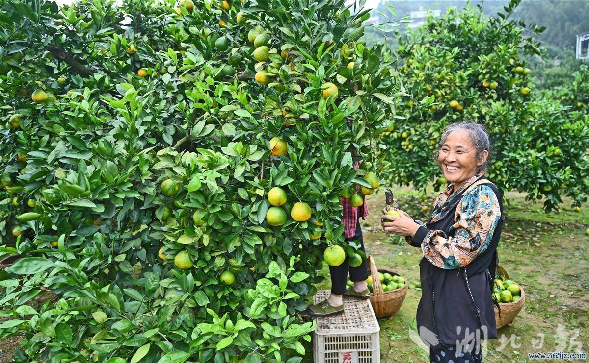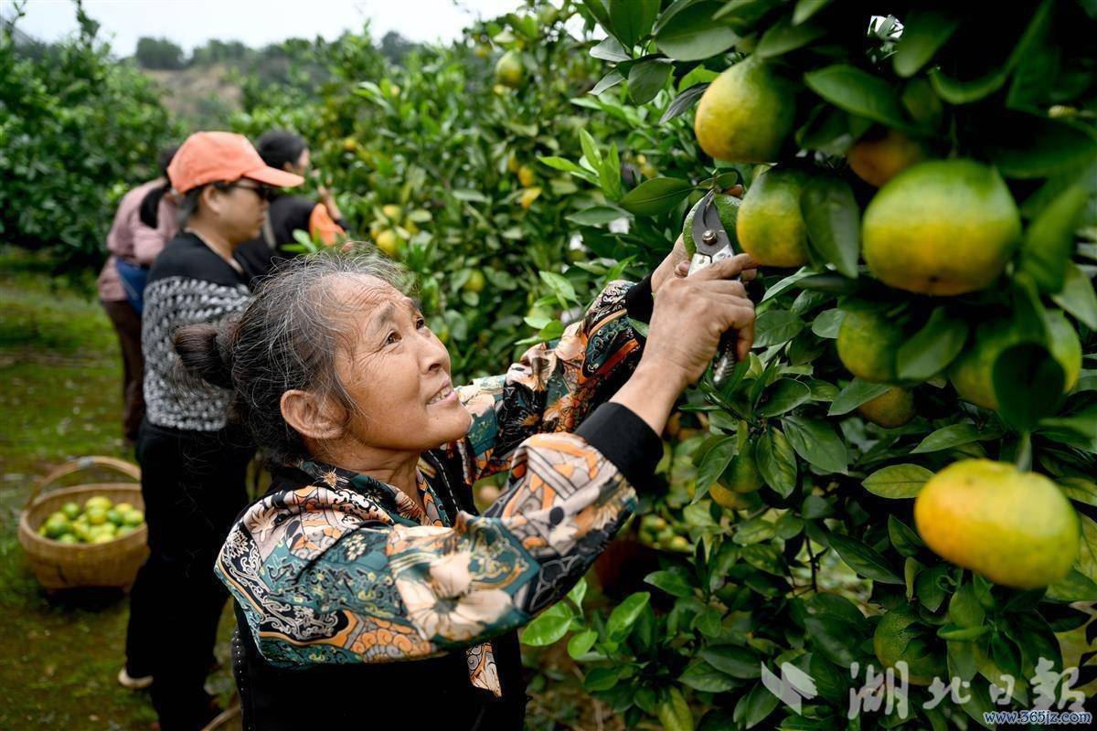 10月10日,宜都市高坝洲镇白鸭垴村的清江橙示范基地里,连绵的橘树春深似海,黄绿相间的果实压弯枝端。果农们正重荷地进行采摘,田间地头处处飘溢着丰充的本心。